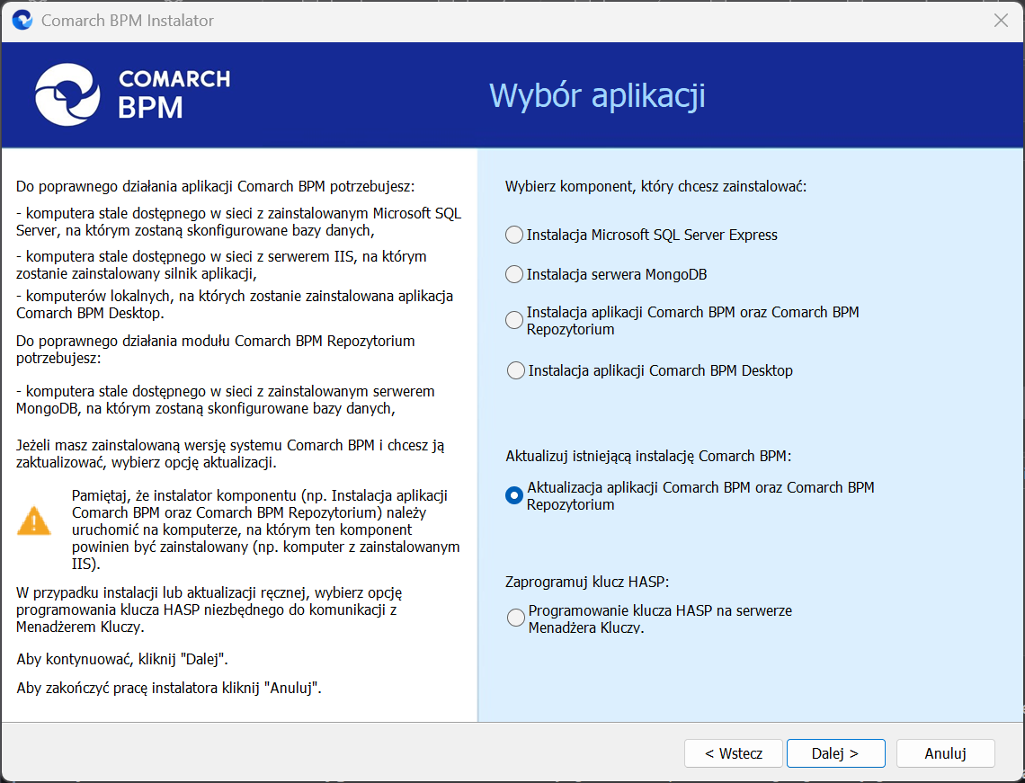 Instalator Comarch BPM (dawniej DMS) umożliwia również aktualizację aplikacji serwerowej i aktualizację aplikacji WEB Comarch BPM (dawniej DMS) oraz aktualizację aplikacji Comarch BPM (dawniej DMS) Repozytorium.