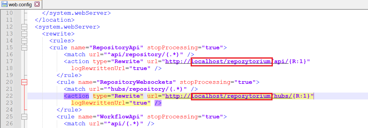 <action type=”Rewrite” url=”http://localhost/repozytorium/hubs/{R:1}”
