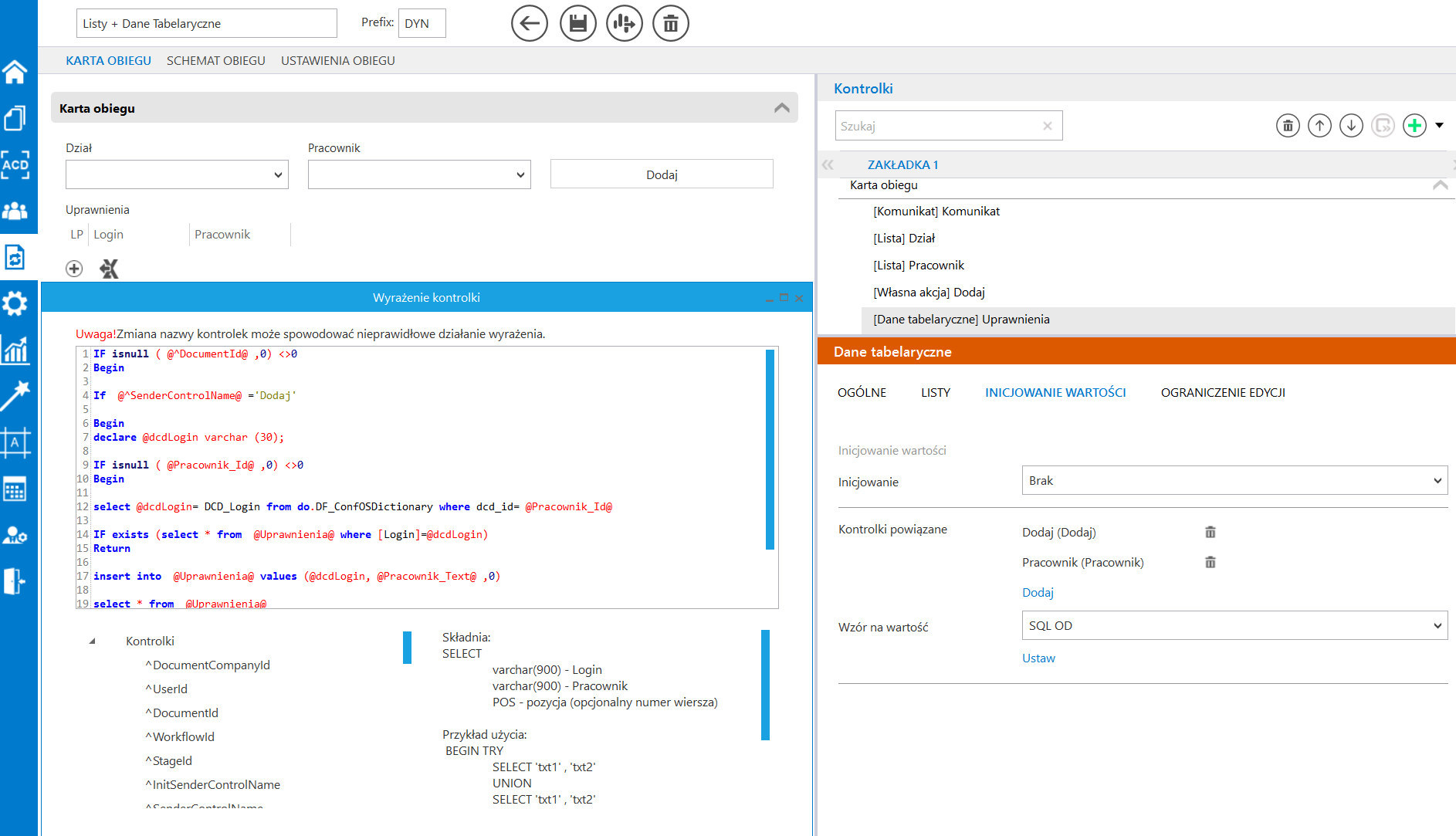 1. Dodanie pól wyboru: Poza kontrolką Dane tabelaryczne należy umieścić dwie niezależne listy (np. Dział i Pracownik), konfigurując między nimi standardową zależność (obserwowanie pól). 2. Konfiguracja Własnej akcji: Należy dodać przycisk (np. „Dodaj”), który będzie pełnił funkcję wyzwalacza zapisu. Kontrolka ta nie zawiera kodu. 3. Inicjowanie wartości w tabeli: W ustawieniach kontrolki Dane tabelaryczne (zakładka Inicjowanie wartości) należy zdefiniować zapytanie SQL, które po kliknięciu przycisku pobierze wartości z pól pomocniczych i wstawi je jako nowy wiersz do tabeli.