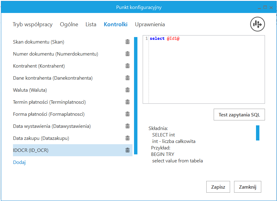 6.Punkt ACD: W punkcie konfiguracyjnym ACD (Współpraca z Comarch OCR), wykorzystywanym do inicjowania obiegu, na zakładce Kontrolki dodano kontrolkę ID_OCR i przypisano jej odpowiednie zapytanie: