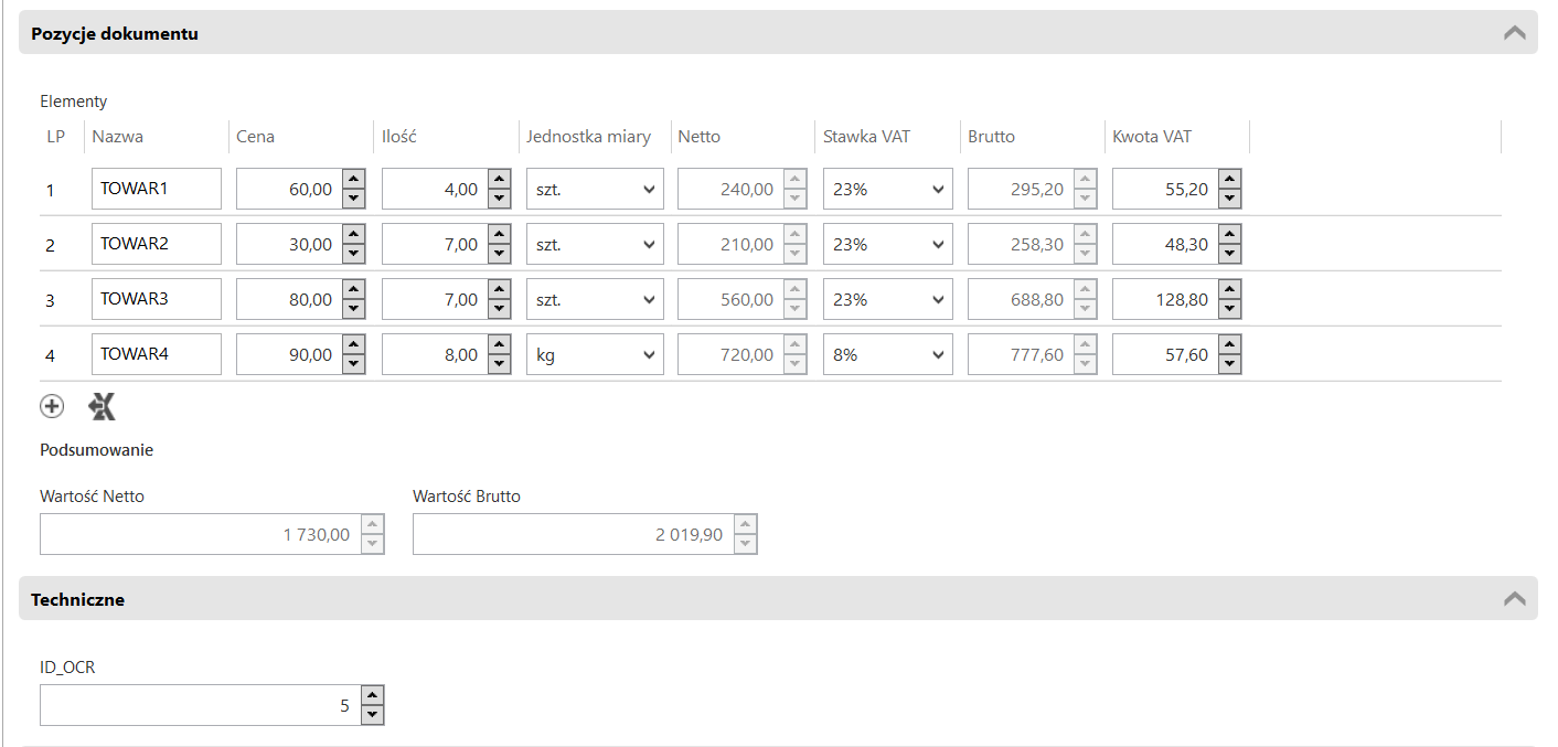- Na podstawie zwróconych wierszy z tabeli do.OC_Document_Items, kontrolka Dane tabelaryczne jest automatycznie wypełniana pozycjami faktury (Nazwa, Cena, Ilość, Jednostka miary, Netto, Stawka VAT, Brutto, Kwota VAT).
