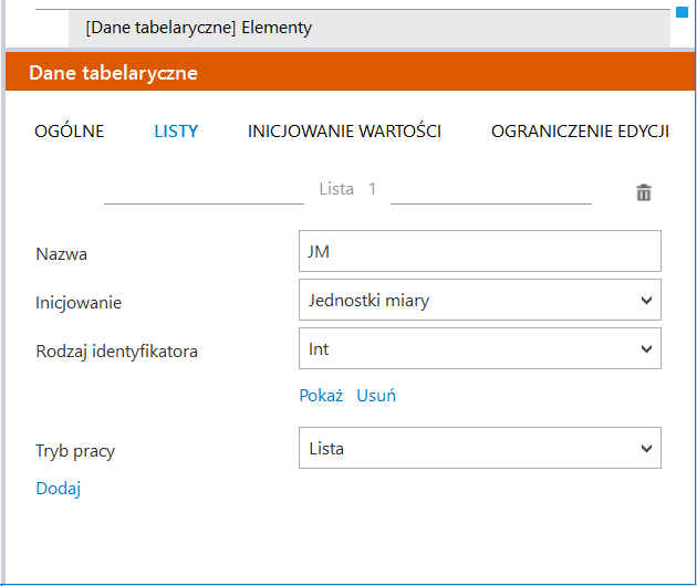 - ”Jednostka miary” (identyfikator kolumny: JM) – typ Lista