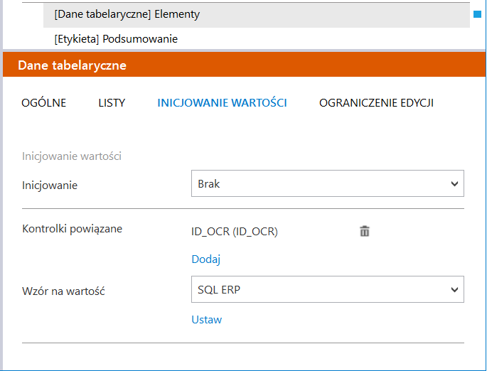 4.Dodano obserwację kontrolki: W kontrolce typu Dane tabelaryczne, na zakładce Inicjowanie wartości, dodano powiązanie do kontrolki ID_OCR.