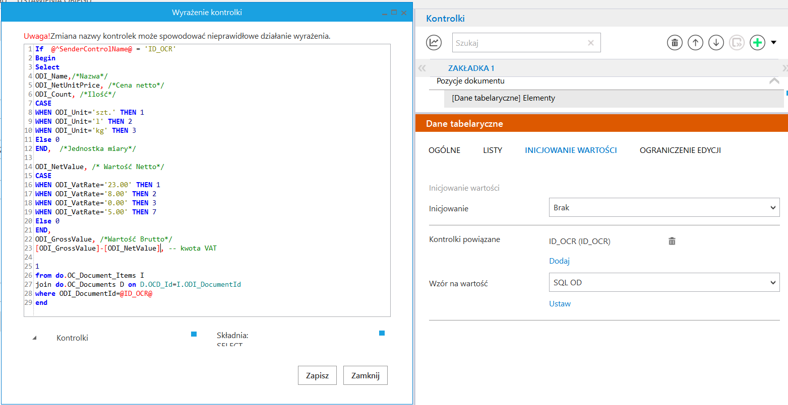 5.Zapytanie SQL: W kontrolce typu Dane tabelaryczne, na zakładce Inicjowanie wartości w sekcji Wzór na wartość SQL OD dodano zapytanie, które pobiera dane z tabel do.OC_Document_Items oraz do.OC_Documents na podstawie przekazanego parametru @ID_OCR@ (ID dokumentu OCR). W zapytaniu SQL konieczne jest użycie logiki CASE WHEN do konwersji wartości tekstowych jednostek miary (’szt’) i stawek VAT (np. '23.00′) na odpowiednie identyfikatory liczbowe akceptowane przez Comarch BPM.