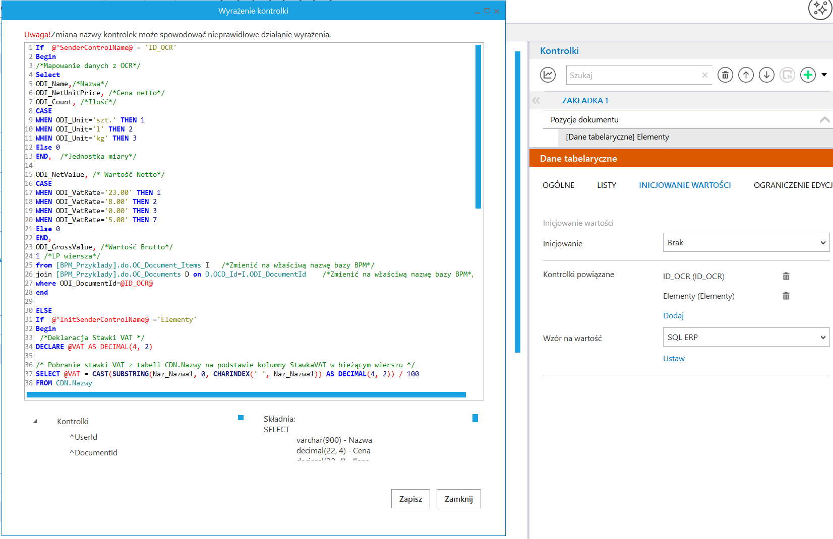 5.Zintegrowane zapytanie SQL do obsługi obu trybów: W kontrolce typu Dane tabelaryczne, na zakładce Inicjowanie wartości w sekcji Wzór na wartość SQL ERP dodano zapytanie, które pobiera dane z tabel do.OC_Document_Items oraz do.OC_Documents na podstawie przekazanego parametru @ID_OCR@ (ID dokumentu OCR). W zapytaniu SQL konieczne jest użycie logiki CASE WHEN do konwersji wartości tekstowych jednostek miary (’szt’) i stawek VAT (np. '23.00′) na odpowiednie identyfikatory liczbowe akceptowane przez Comarch BPM. Dodano również zapytanie, które na podstawie Ilości i Ceny wylicza wartość Netto, po zmianie Stawki VAT wylicza wartość Brutto, a po zmianie wartości Brutto wylicza Cenę i wartość Netto.