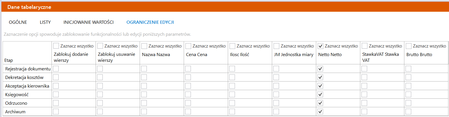 - Tryb pracy: W kontrolce typu Dane tabelaryczne, na zakładce Ograniczenie edycji kolumnę „Netto” ustawiono w trybie „Do odczytu”.