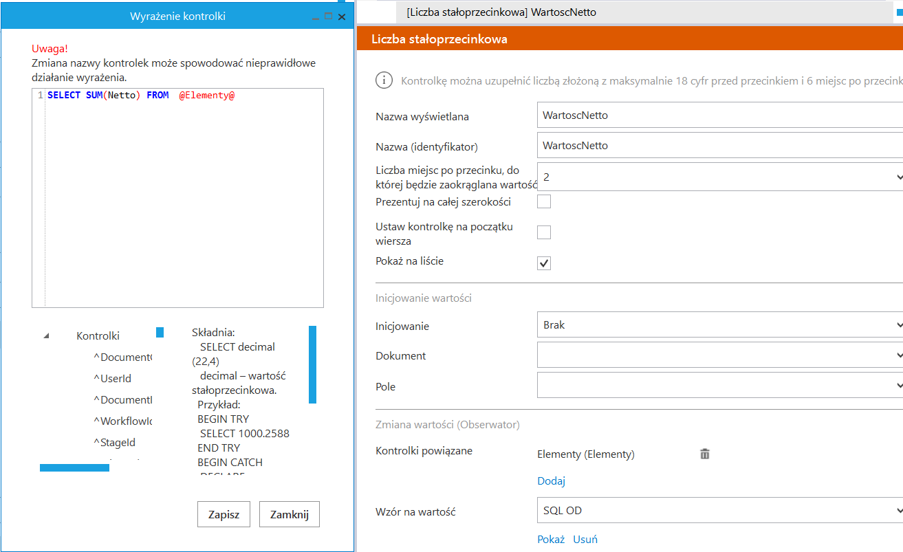 - Utworzono kontrolkę liczbową: Dodano kontrolkę typu Liczba stałoprzecinkowa o nazwie (identyfikatorze) WartoscNetto, w której dodano powiązanie do kontrolki Elementy i skonfigurowano w niej zapytanie, które zlicza wartość z kolumny Netto z kontrolki tabelarycznej: