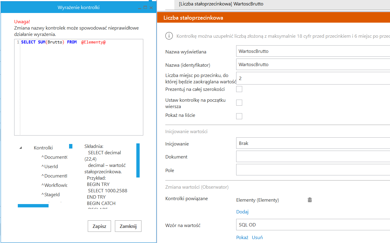 - Utworzono kontrolkę liczbową: Dodano kontrolkę typu Liczba stałoprzecinkowa o nazwie (identyfikatorze) WartoscBrutto, w której dodano powiązanie do kontrolki Elementy i skonfigurowano w niej zapytanie, które zlicza wartość z kolumny Brutto z kontrolki tabelarycznej: