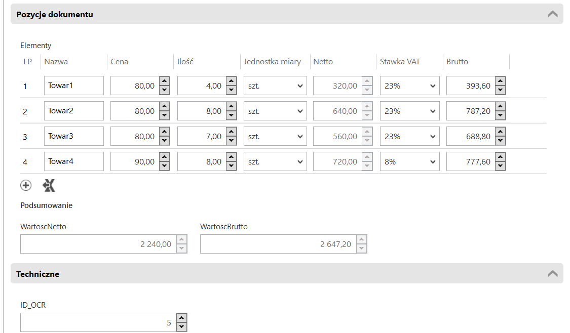 Po pomyślnym zainicjowaniu dokumentu z punktu ACD, kontrolka typu Dane Tabelaryczne została automatycznie wypełniona pozycjami odczytanymi przez OCR. Dla każdej pozycji, system automatycznie przeliczył i uzupełnił wartości w kolumnach Netto i Brutto w tym samym wierszu. W przypadku nieprawidłowości w kwotach możliwe jest przeliczanie wartości w przód (Cena/Ilość -> Netto/Brutto) oraz w tył (Brutto -> Cena/Netto). Kolumna Netto jest zablokowana do ręcznej edycji (tryb „Do odczytu”), co gwarantuje poprawność danych. Kontrolka WartoscNetto wyświetla poprawną sumę końcową z kolumny Netto kontrolki Dane tabelaryczne. Kontrolka WartoscBrutto wyświetla poprawną sumę końcową z kolumny Brutto kontrolki typu Dane tabelaryczne.