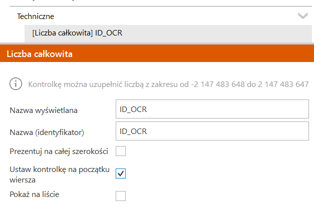 1.Utworzono kontrolkę ID_OCR: Na karcie obiegu dodano kontrolkę typu Liczba całkowita o nazwie (identyfikatorze) ID_OCR, do której będzie zapisywane ID OCR-owanego dokumentu.
