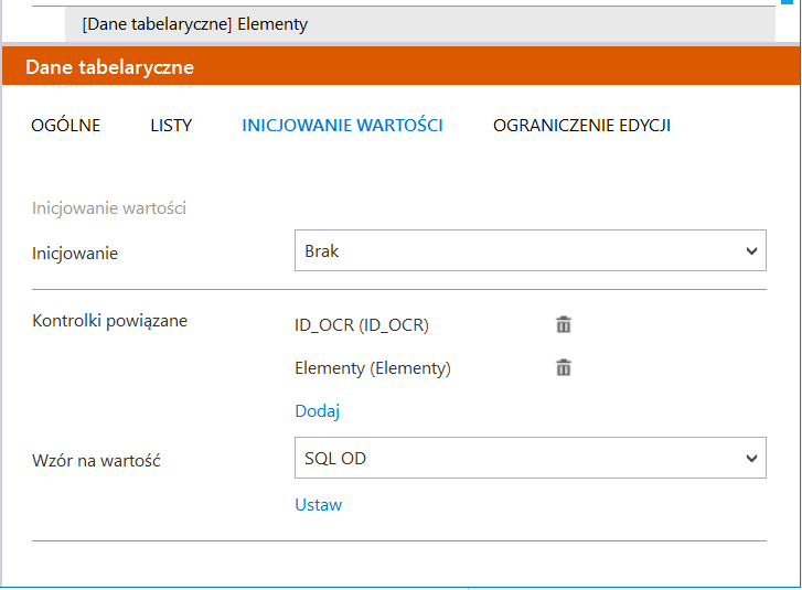 4.Dodano obserwację kontrolki: W kontrolce Dane tabelaryczne, na zakładce Inicjowanie wartości, dodano powiązanie do kontrolki ID_OCRoraz do samej siebie.