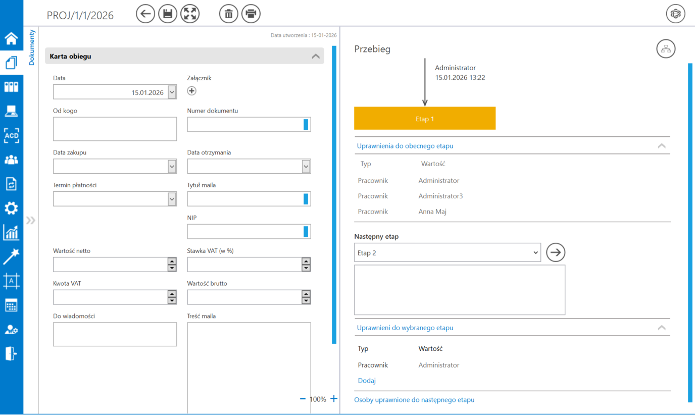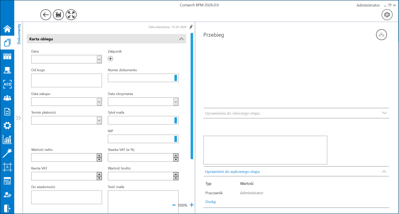 • otwartym oknie dokumentu można uzupełnić kontrolki dostępne w danym typie obiegu lub pozostawić je puste (w kwestii opisu kontrolek zob. przykładowo Kontrolki)