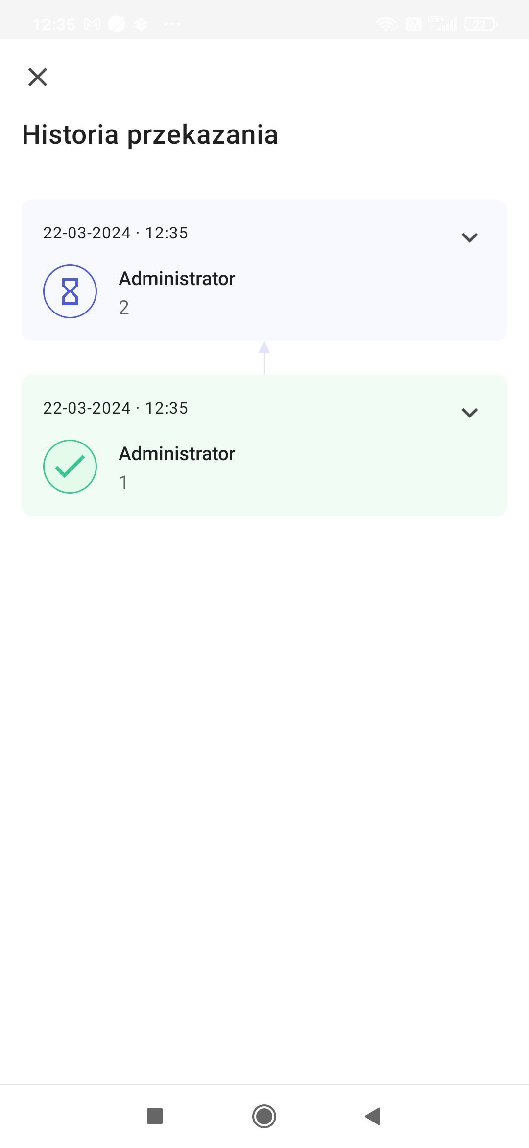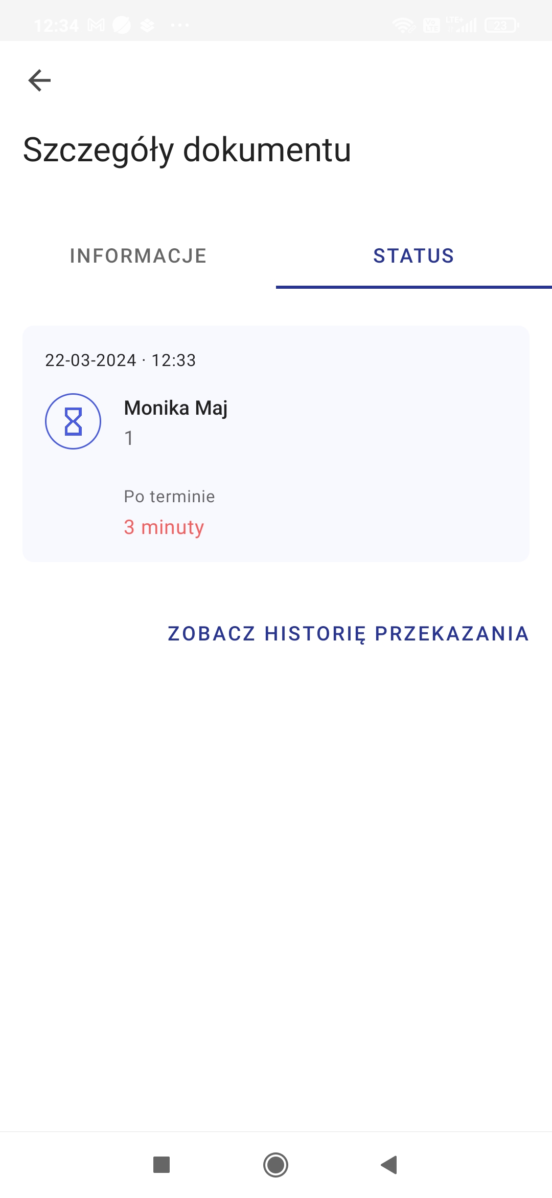 Aby powrócić do okna „Szczegóły dokumentu”, należy kliknąć w znak X w lewym górnym rogu okna „Historia przekazania”
