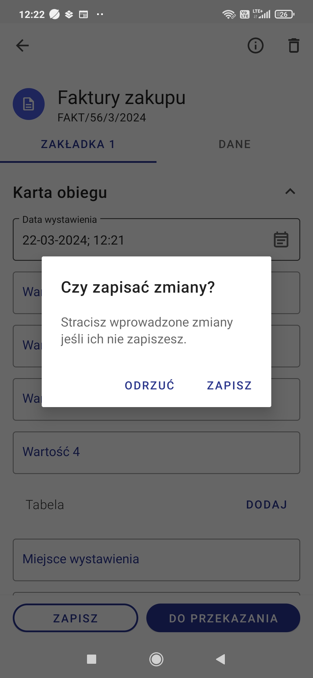 - funkcjonalność Zapis – przy modyfikacji danych na utworzonym dokumencie – zapisuje tylko zmiany w wartościach kontrolek z sekcji karta obiegu.