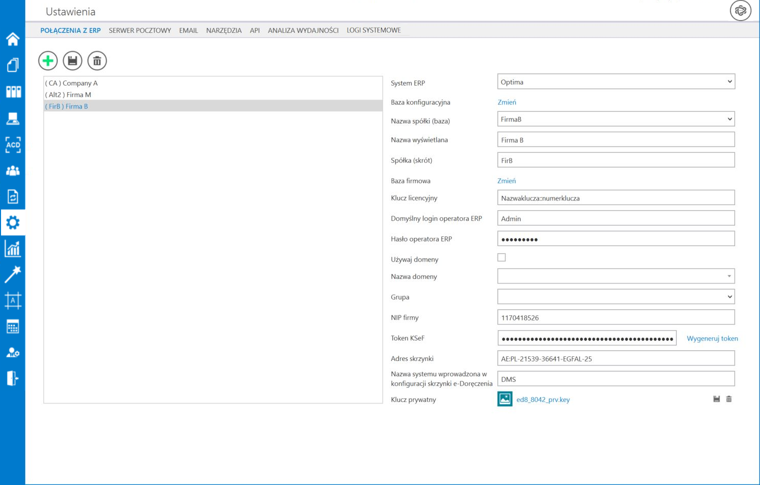 Po włączeniu wielofirmowego trybu pracy w Comarch DMS poprzez zmianę wartości klucza „MultiCompany=true” w pliku konfiguracyjnym Web.config, zakładka „Autoryzacja API” zostaje zastąpiona zakładką „Połączenia z ERP”, na której definiowane są spółki.
