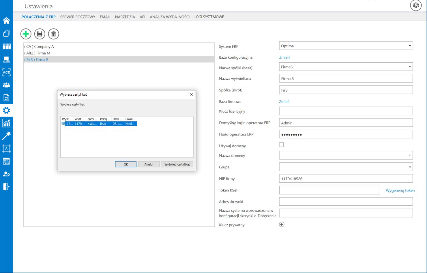 [Wygeneruj token] znajdujący się obok pola „Token KSeF”, a następnie w oknie „Wybierz certyfikat” wybrać odpowiedni certyfikat uwierzytelniający. Po wyborze certyfikatu zostanie wygenerowany token KSeF, który zostanie automatycznie wprowadzony w ramach pola „Token KSeF”.
