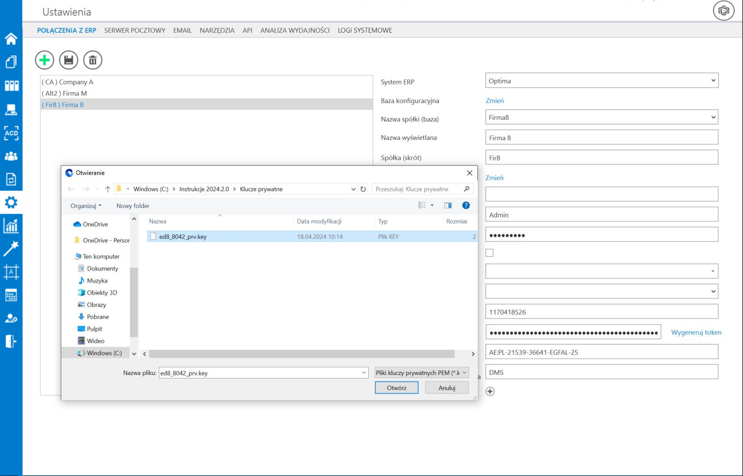 , dostępny w ramach pola, a następnie w ramach otwartego okna systemowego wybrać odpowiedni klucz PEM i kliknąć w przycisk