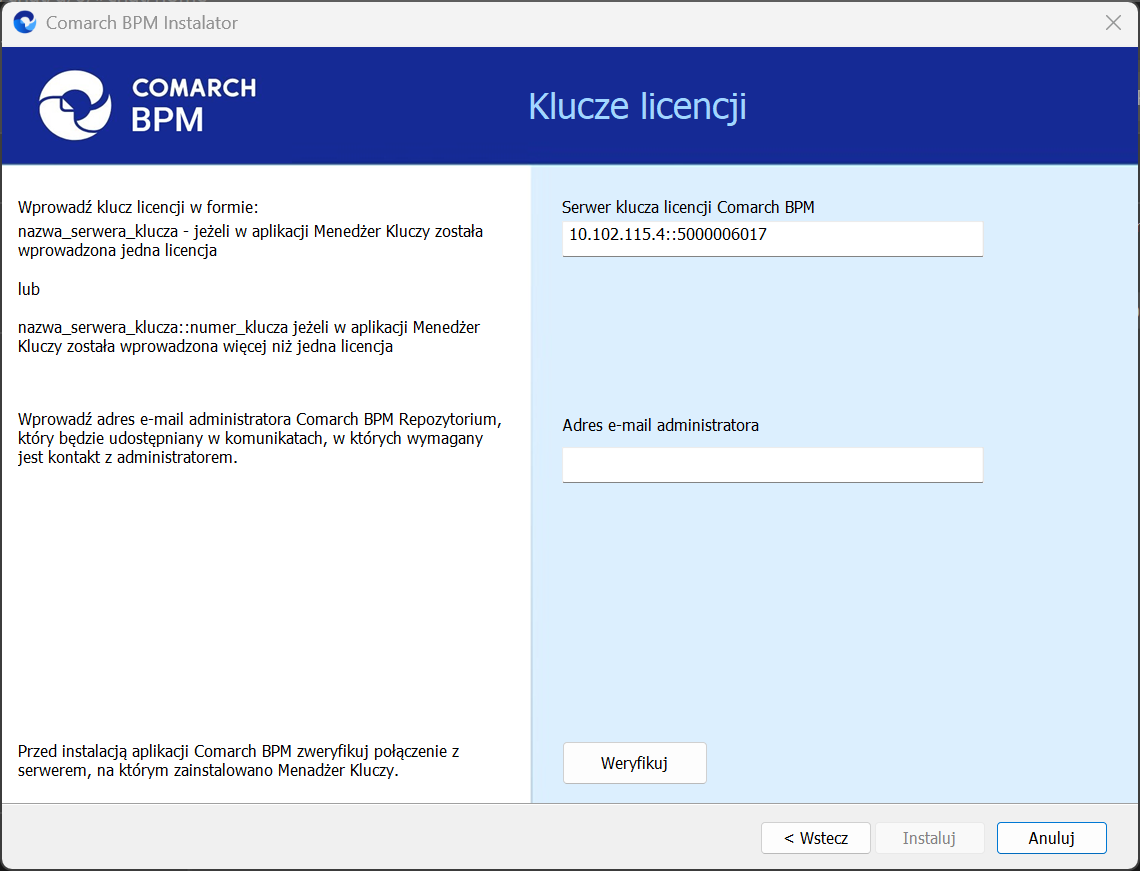 - W ramach pola „Serwer klucza licencji Comarch BPM” – klucz licencji dla Comarch BPM (dawniej DMS)