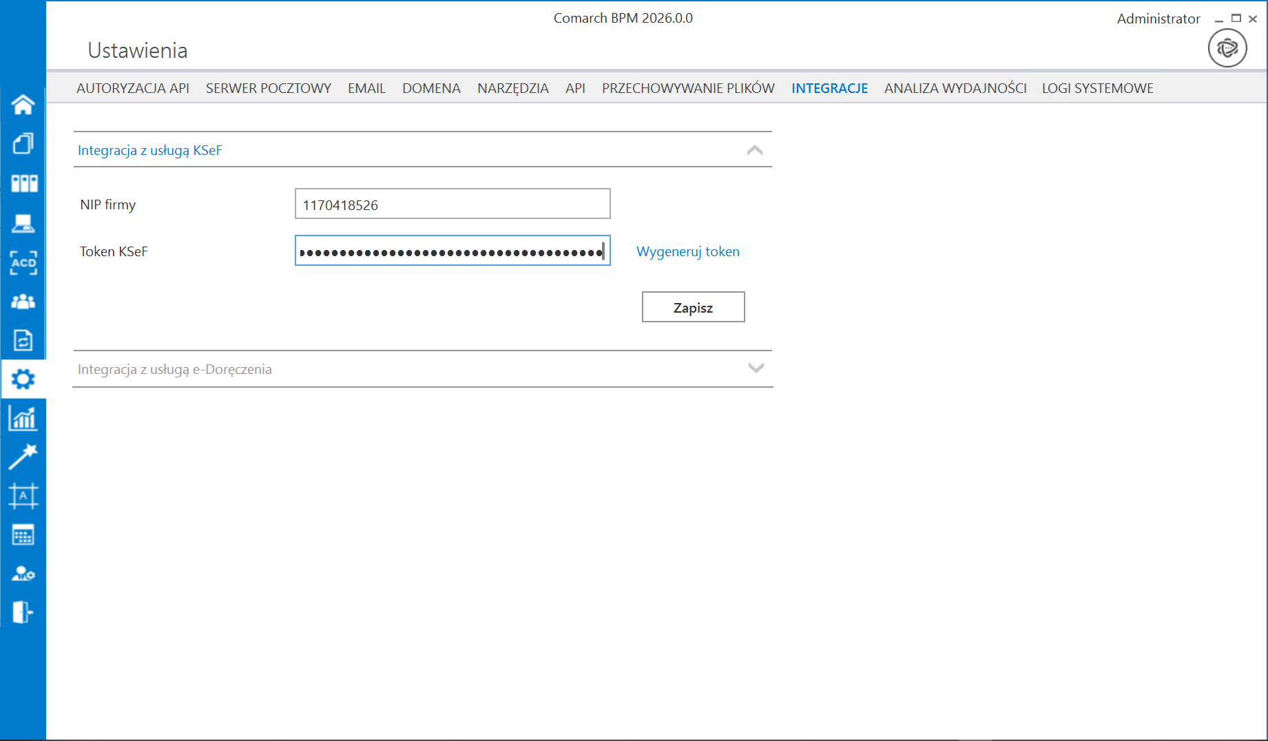 Jeśli Comarch BPM (dawniej DMS) pracuje w trybie wielospółkowym, wówczas należy uzupełnić pola „NIP firmy” i „Token KSeF” na zakładce „Połączenia z ERP” (zob. przykładowo Połączenia z ERP).