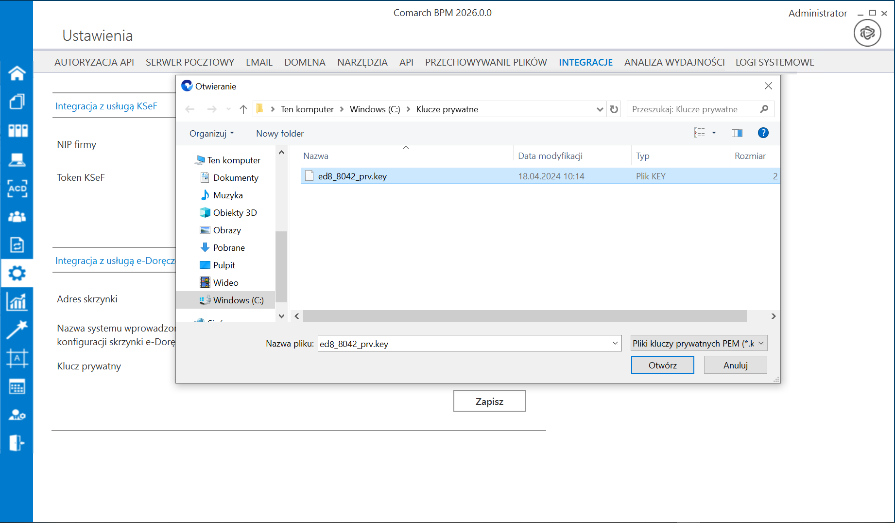 • Klucz prywatny – pole, w którym należy dodać klucz prywatny, który jest pozyskiwany w procesie generowania certyfikatudostarczony razem z certyfikatem. Aby dodać klucz prywatny, należy kliknąć w przycisk , dostępny w ramach pola, a następnie w ramach otwartego okna systemowego wybrać odpowiedni klucz PEM i kliknąć w przycisk [Otwórz]. Klucz prywatny, który dodano do definicji punktu ACD, może zostać usunięty z punktu za pomocą ikony lub zapisany na dysku za pomocą ikony .