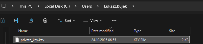 Plik private_key.key zostanie utworzony domyślnie w bieżącym katalogu roboczym, z którego uruchomiono polecenie.