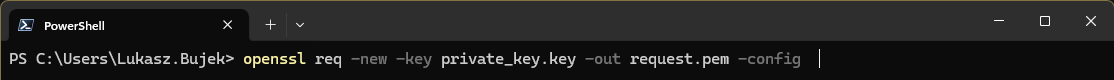 W efekcie otrzymamy plik request.pem z zapisanym żądaniem CSR, wygenerowany za pomocą klucza prywatnego private_key.key