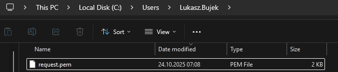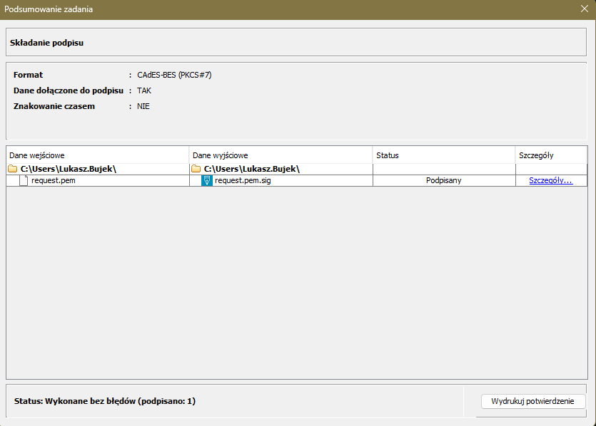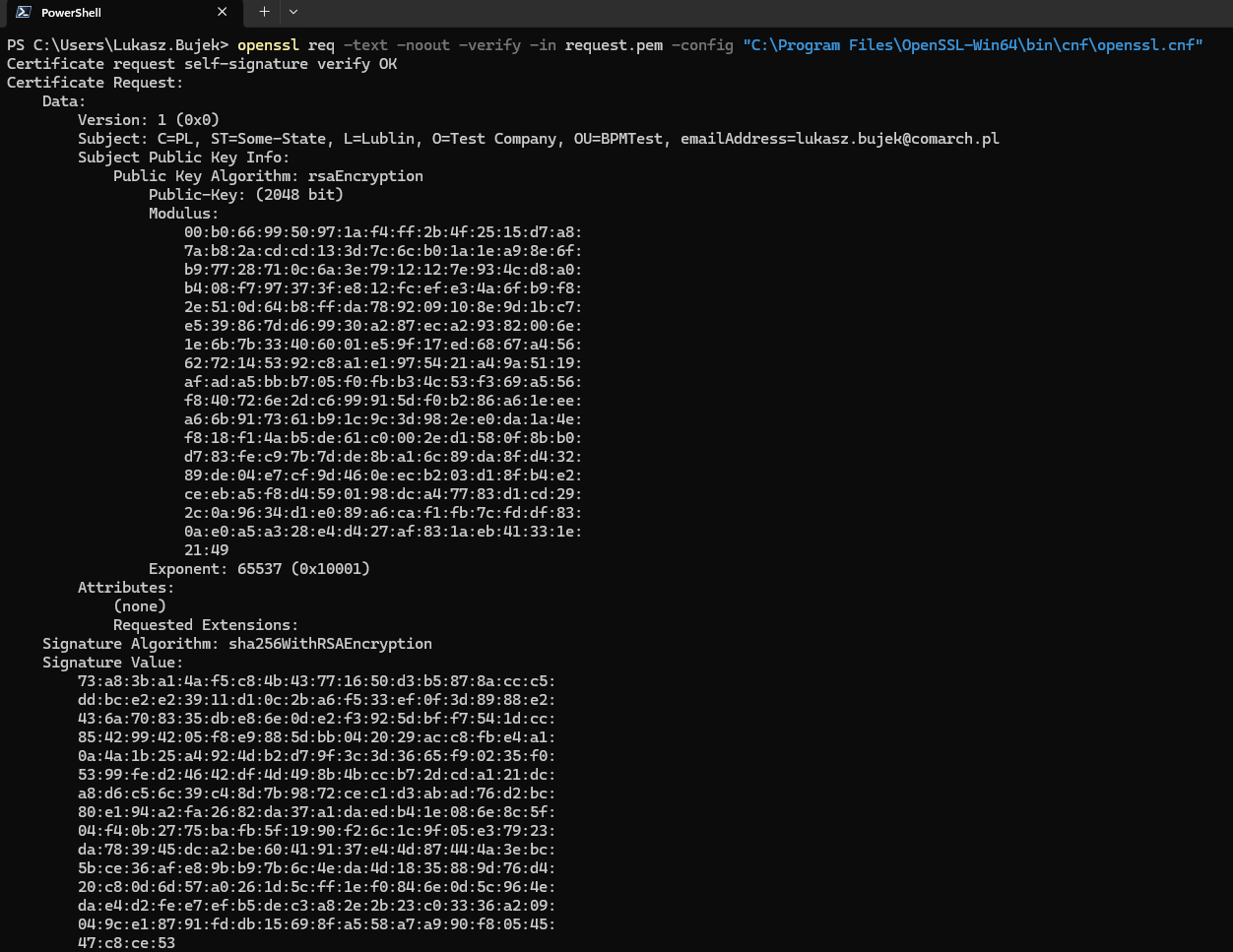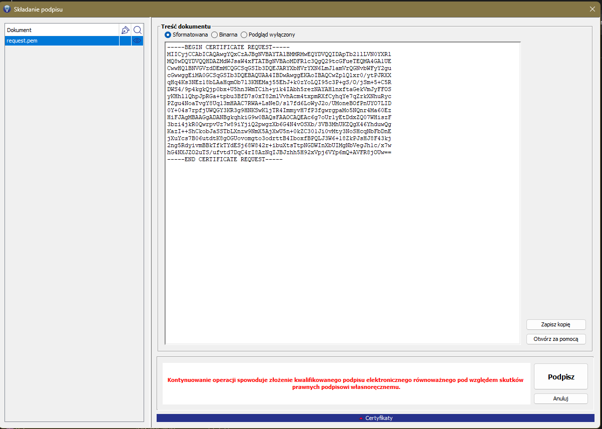 - Jeżeli dane są poprawne, plik request.pem można będzie przesłać do podmiotu certyfikującego w celu uzyskania kwalifikowanej pieczęci elektronicznej