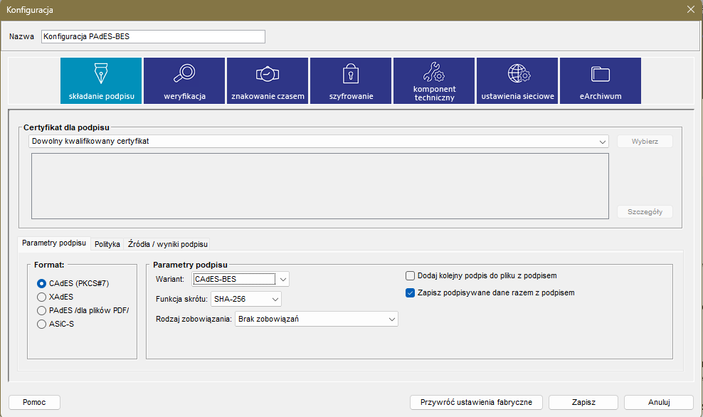 - w sekcji Parametry podpisu zaznaczyć opcję Zapisz podpisywane dane razem z podpisem,