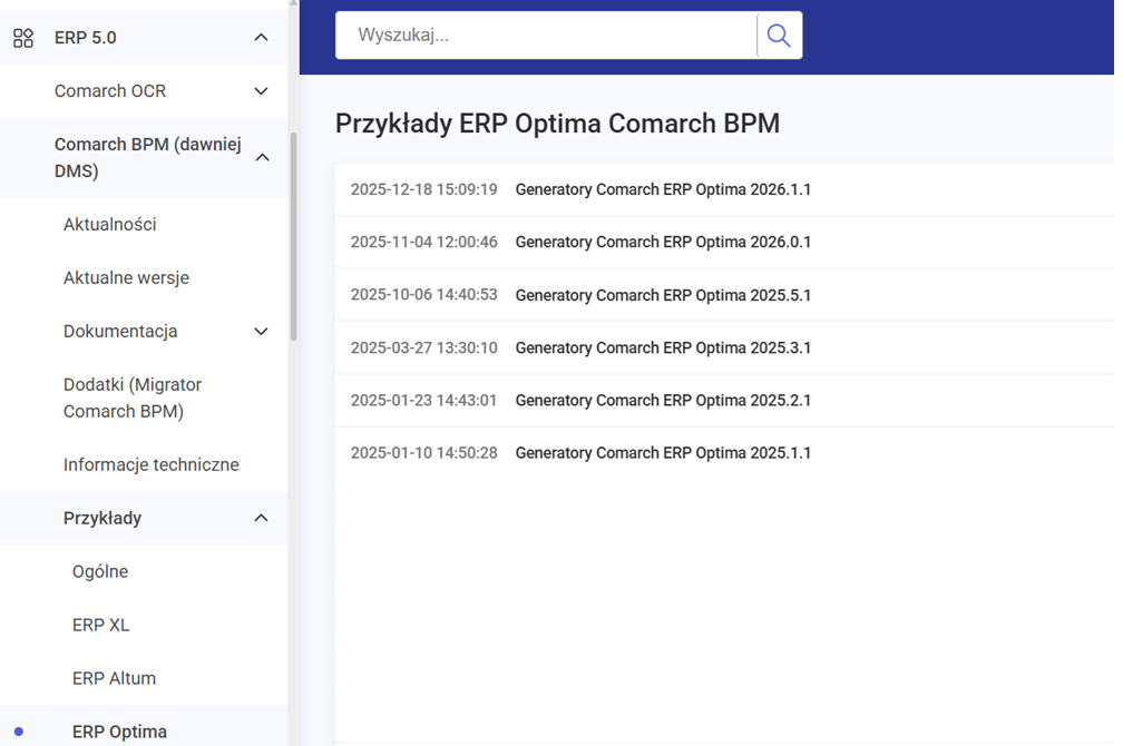 Przykład jest oparty na definicji typu obiegu dostępnej na stronach walidowanych w sekcji ERP 5.0->Comarch BPM (dawniej DMS)->Przykłady->ERP Optima. Razem z przykładem udostępnione są pliki exe, które umożliwiają wygenerowanie dokumentu do Comarch ERP Optima. Aby skorzystać z tej funkcjonalności należy pobrać przykład adekwatny do wersji Comarch ERP Optima