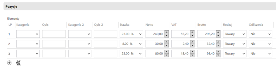 • Automatyczne kalkulowanie wartości: Kontrolka tabelaryczna uzyskuje zdolność automatycznego przeliczania wszędzie tam, gdzie zmienione zostaną dane wejściowe (np. Netto, Stawka VAT, Brutto) przez użytkownika.