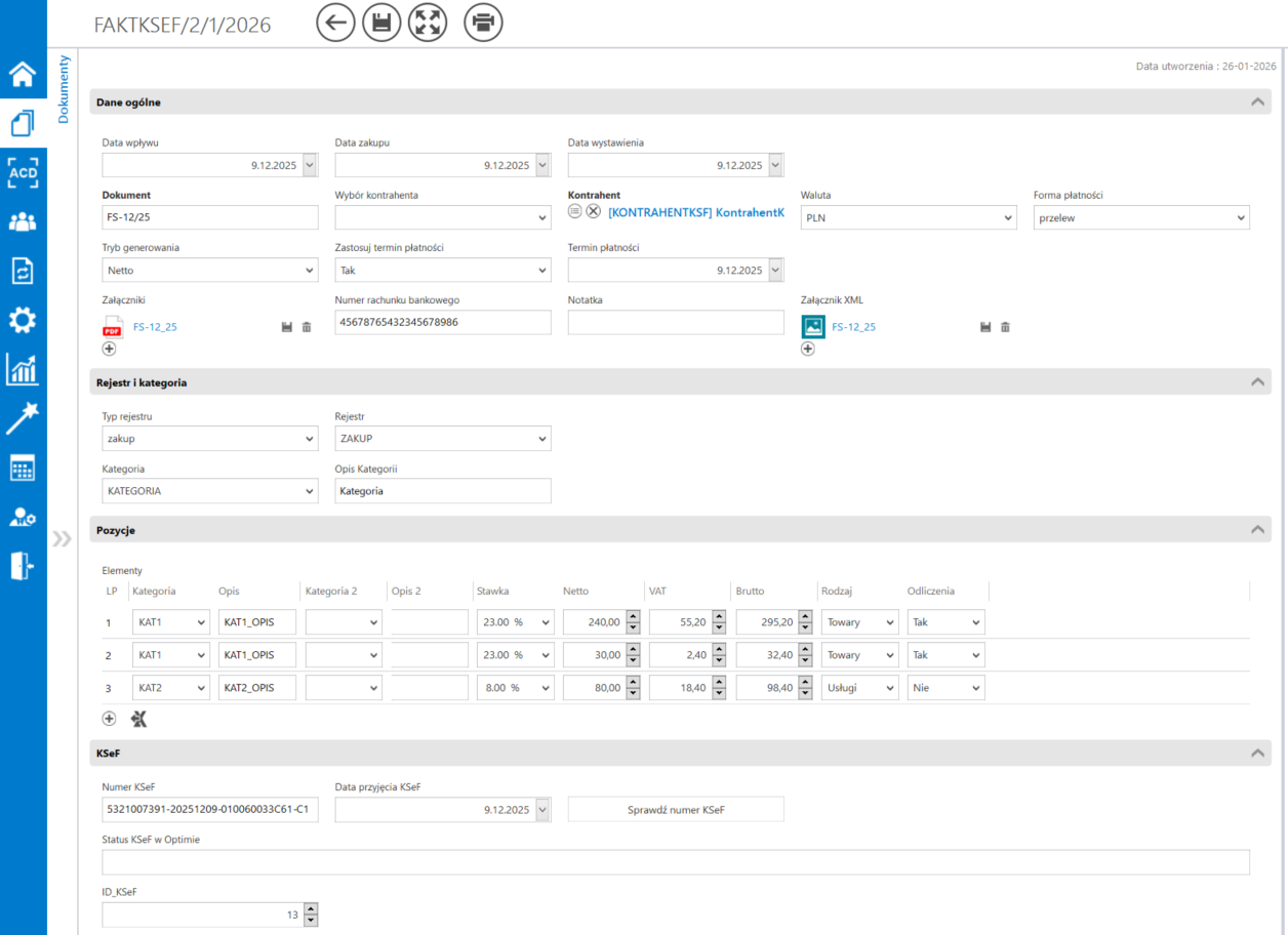 Po pomyślnym pobraniu dokumentu z KSeFpunkcie ACD (Import dokumentów zakupu z KSeF), dane nagłówkowe oraz identyfikator dokumentu uzupełniły się automatycznie w kontrolkach na podstawie danych odczytanych z pliku XML.
