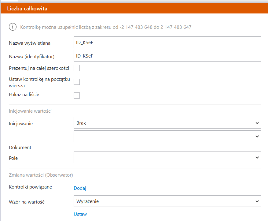 1. Utworzono kontrolkę ID_KSeF: Na karcie obiegu dodano kontrolkę typu Liczba całkowita o nazwie (identyfikatorze) ID_KSeF, do której będzie zapisywane ID dokumentu KSeF.