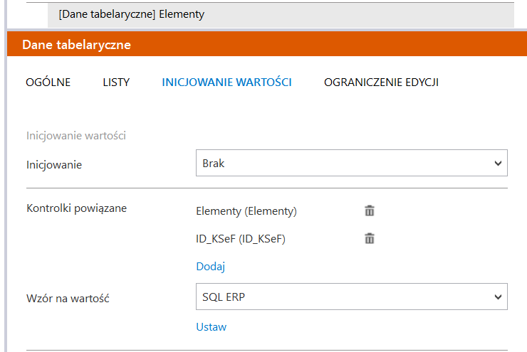 4. Dodano obserwację kontrolki: W kontrolce Dane tabelaryczne, na zakładce Inicjowanie wartości, dodano powiązanie do kontrolki ID_KSeF oraz do samej siebie.