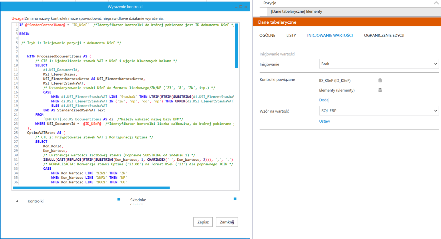 • Tryb Edycji (Interaktywny): Kontrolka Dane Tabelaryczne (Elementy) obserwuje sama siebie (@^SenderControlName@ = ’Elementy’), co aktywuje logikę automatycznego przeliczania wartości w trybie edycji. Pozwala to na ręczne przypisanie stawki VAT oraz przeliczenie pozostałych wartości.