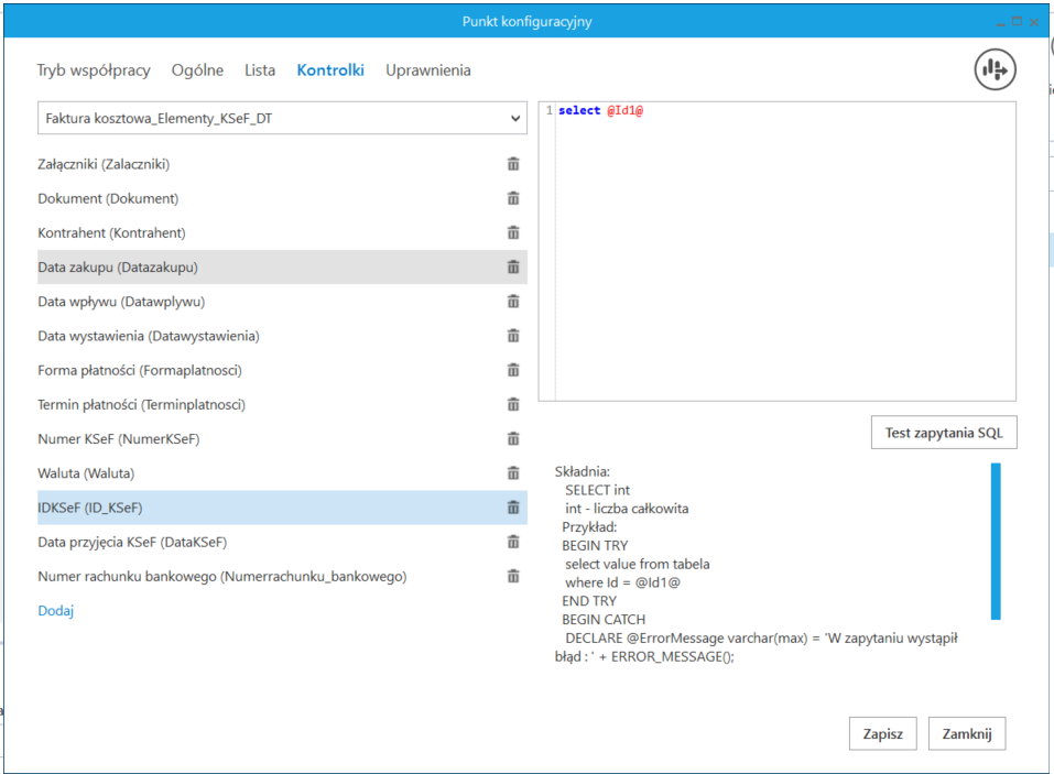 2. W zakładce Kontrolki dodano kontrolkę ID_KSeF, której przypisano zapytanie pobierające identyfikator dokumentu KSEF. Jednocześnie zdefiniowano odpowiednie zapytania SQL dla pozostałych kontrolek, które służą do automatycznego pobierania i wyświetlania danych bezpośrednio z systemu KSeF: