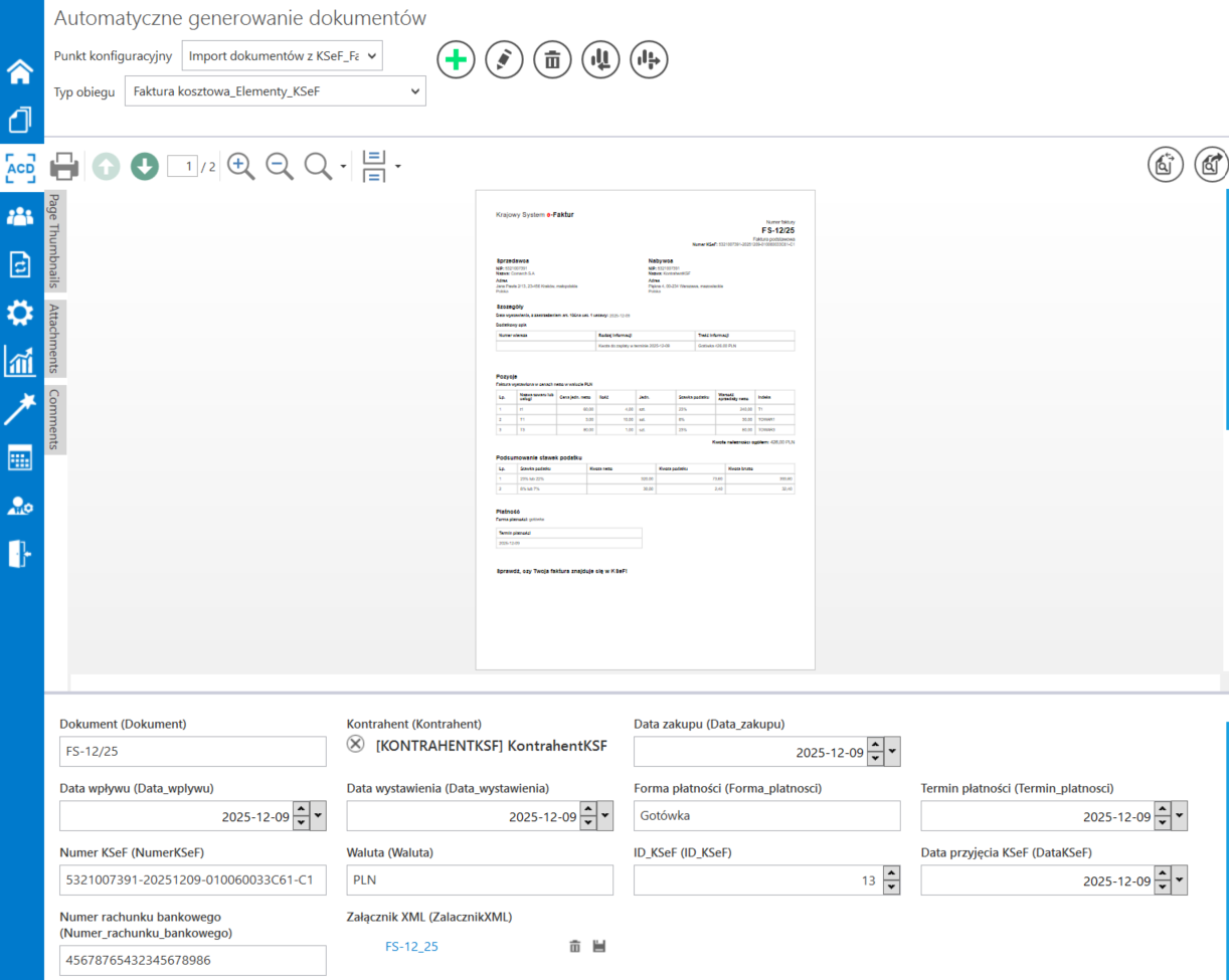 • Punkt konfiguracyjny ACD: Wzorcowa konfiguracja, która jest odpowiedzialna za pobranie ID dokumentu KSeF, Załącznika oraz wszystkich kluczowych danych nagłówkowych (Numer dokumentu, Kontrahent, Data zakupu, Data wystawienia, Data wpływu Termin płatności, Forma płatności, Waluta, Wartość Netto, Wartość Brutto, Numer KSeF, Data przyjęcia z KSeF) oraz utworzenie dokumentu obiegowego.