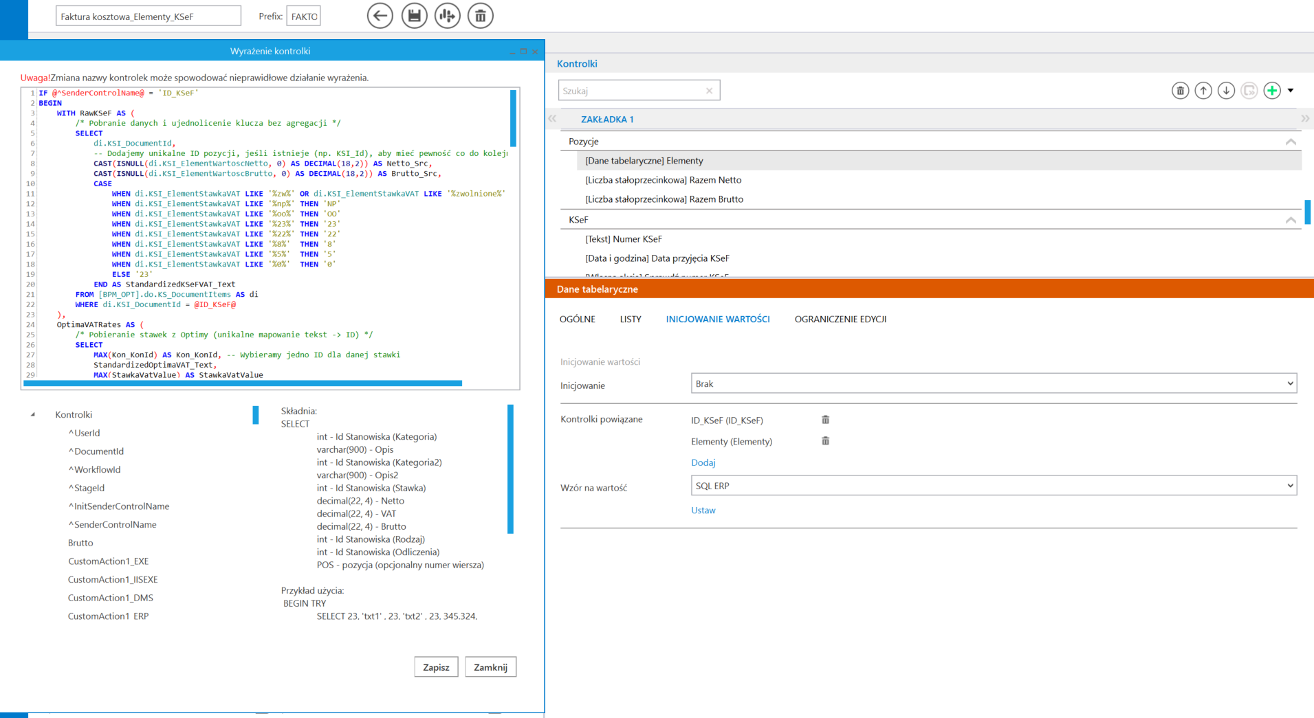 - Ta sekcja jest wywoływana przy każdej modyfikacji danych w kontrolce „Elementy” i wymaga użycia ELSE po sekcji KSeF: