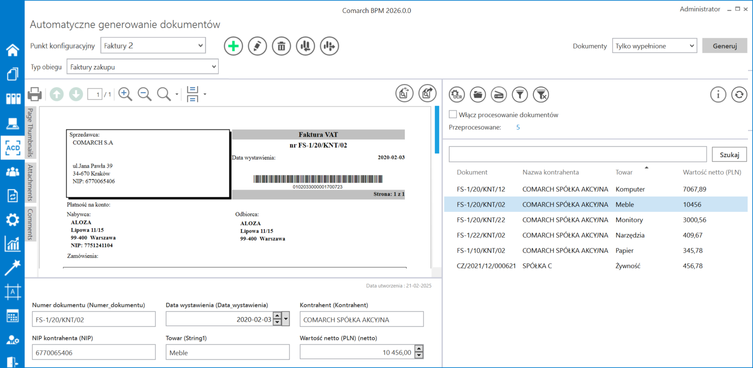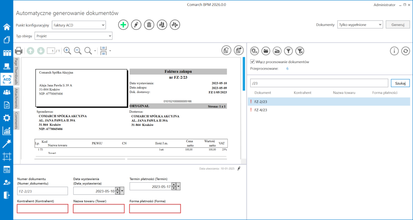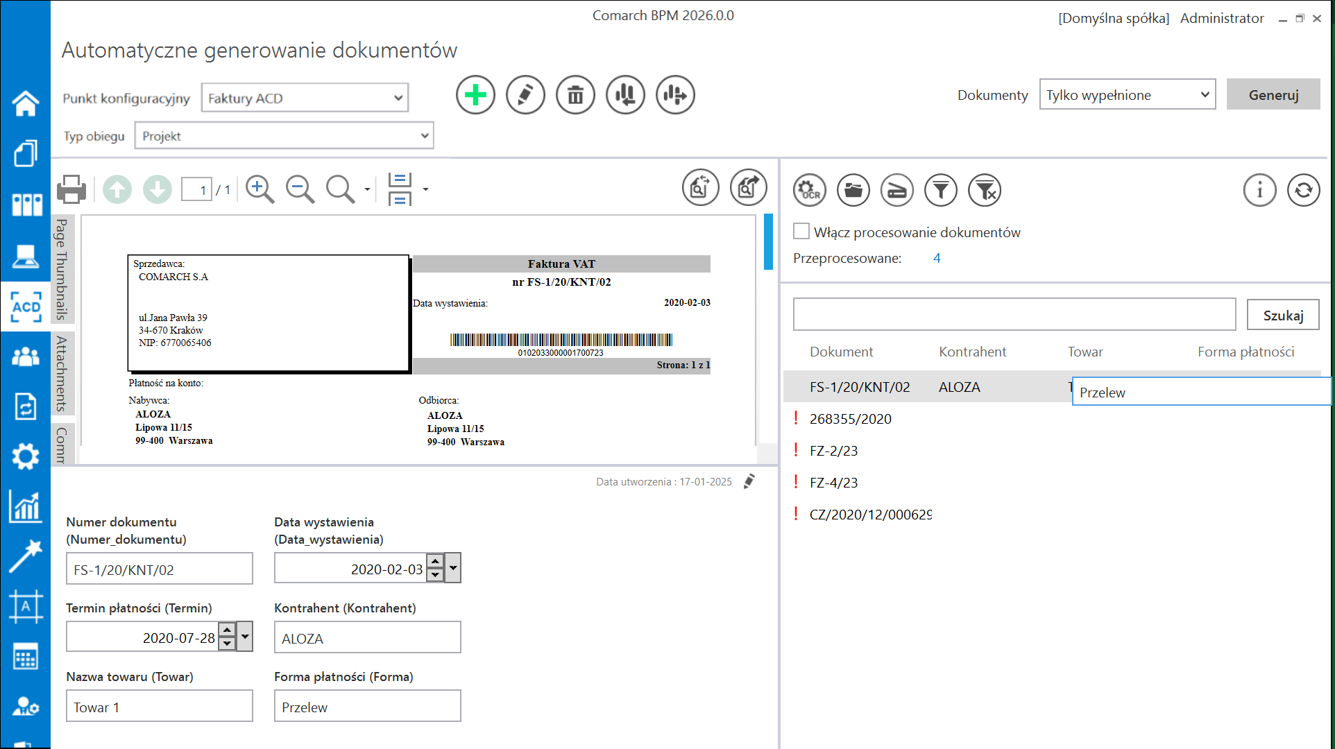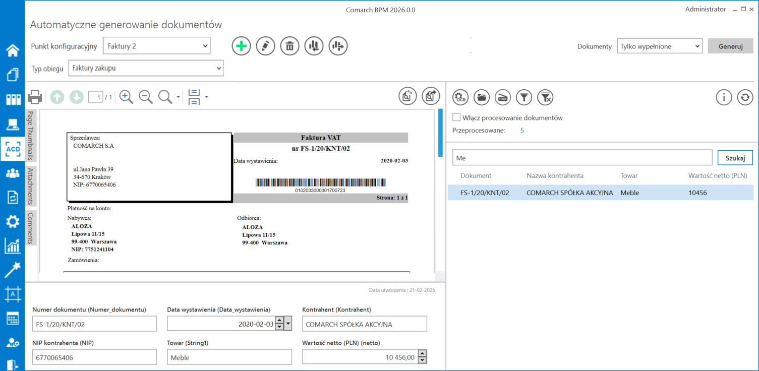 Kiedy wybrany dokument został wygenerowany, jeśli określono wartości kontrolek podczas konfiguracji obiegu, dane, które zostały rozpoznane przez usługę Comarch OCR zostaną wyświetlone w kontrolkach karty obiegu (zob. Przykłady zapytań SQL w zakładce Kontrolki).