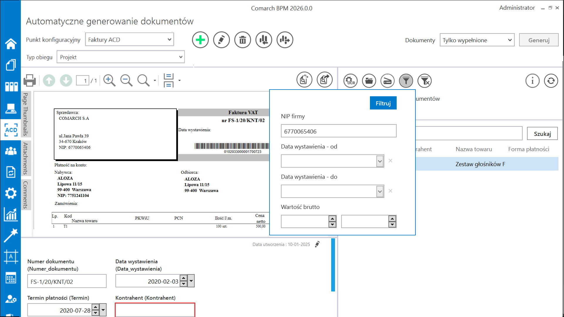 - Nip firmy – umożliwia zawężenie listy według wartości NIP (według danych z kolumny OCD_ContractorNip w tabeli do.OC_Documents);