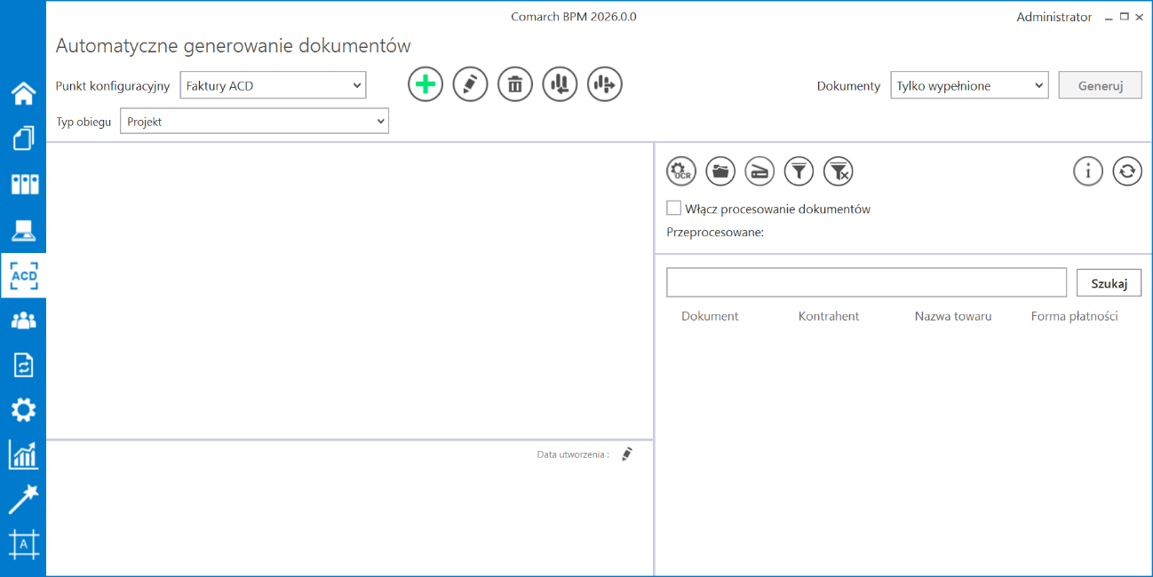 Po wyborze i konfiguracji punktu współpracującego z Comarch OCR (jak omówiono w artykule Definiowanie punktu konfiguracyjnego), w oknie „Automatyczne generowanie dokumentów” prezentowane są przyciski: