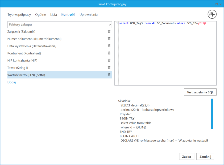 Następnie na zakładce „Kontrolki” wprowadzono zapytania dla kontrolek na karcie obiegu, z wykorzystaniem odwołań do kolumn w tabeli do.OC_Documents (zob. Przykłady zapytań SQL w zakładce Kontrolki lub w zakładce Atrybuty – Baza Wiedzy programu Comarch DMS), z tym, że:
