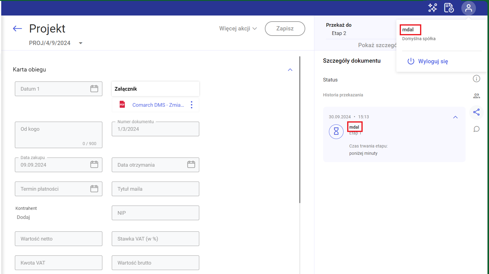 Jednocześnie pracownik Comarch HRM zostaje dodany do listy pracowników w Comarch BPM (dawniej DMS) – nadany login jest widoczny w prawym górnym rogu karty zainicjowanego dokumentu.
