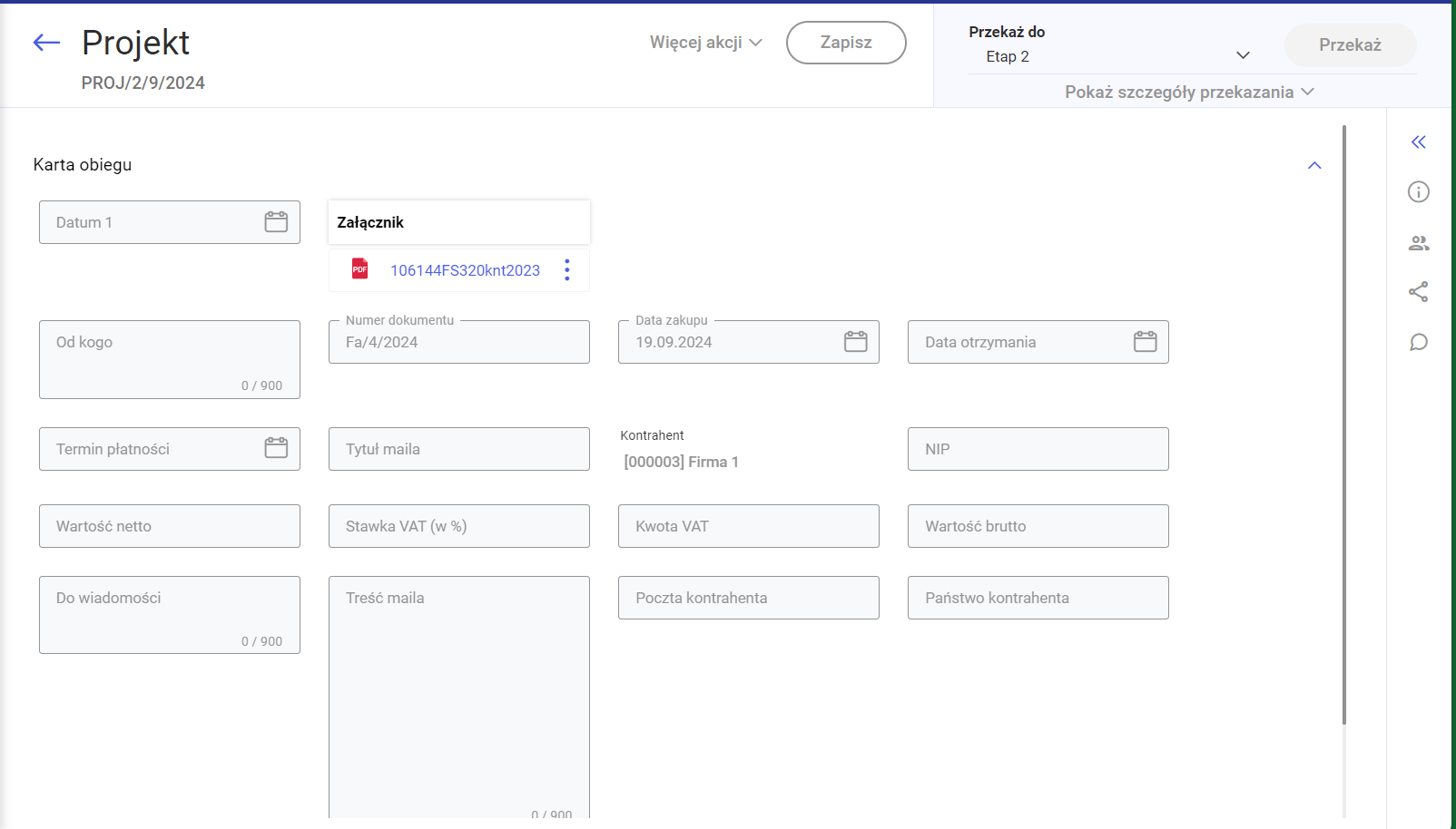 Jeżeli w Comarch BPM (dawniej DMS) nie nadano wcześniej pracownikowi Comarch BPM (dawniej DMS), do którego przypisano danego pracownika Comarch ERP Optima, uprawnień do pierwszego etapu, wówczas dalsza edycja wartości w kontrolkach nie jest możliwa, a panel szczegółów przekazania oraz przycisk „Przekaż” są wyszarzone.