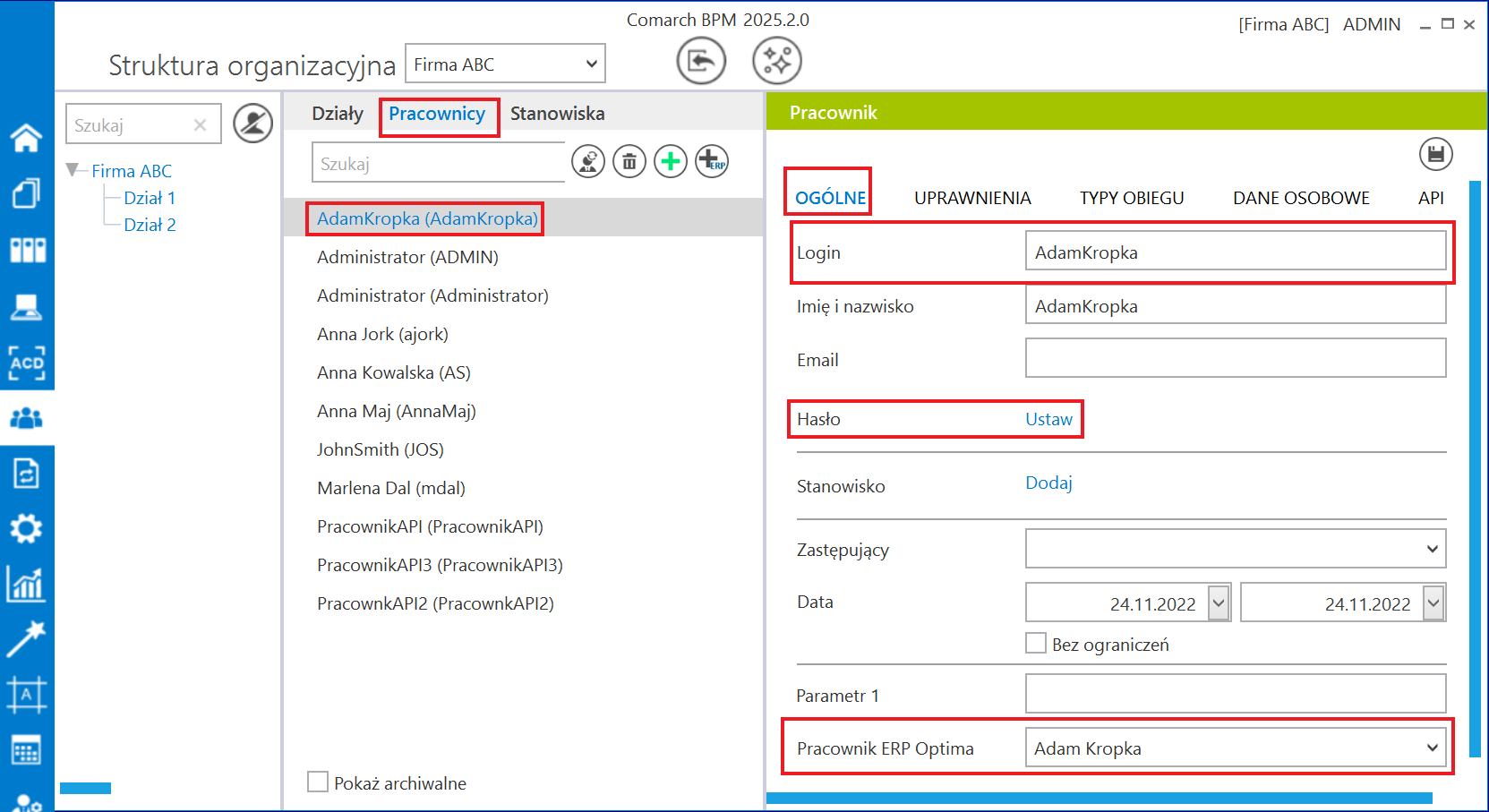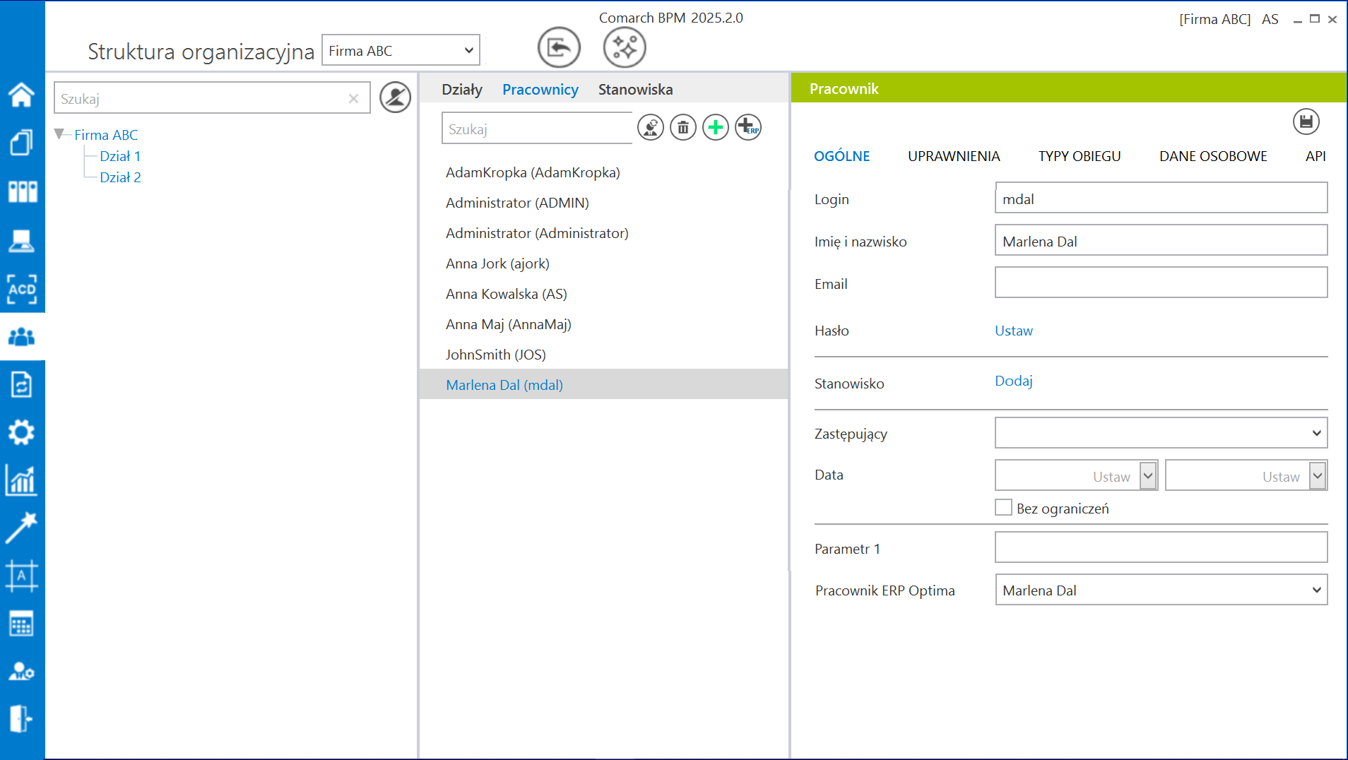 Wyjątek stanowi sytuacja, w której pracownikowi Comarch BPM (dawniej DMS), do którego przypisano pracownika Comarch ERP Optima, nadano uprawnienia do pierwszego etapu w definicji danego obiegu w Comarch BPM (dawniej DMS).