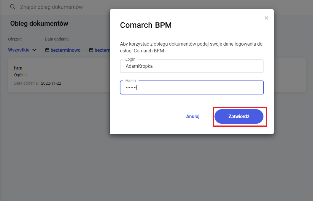 Po wpisaniu poprawnych danych w oknie „Comarch BPM” pracownik Comarch HRM powinien nacisnąć przycisk „Zatwierdź”.