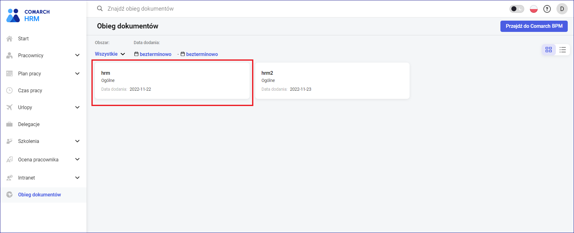 Następnie pracownik Comarch HRM powinien kliknąć na jeden z widocznych dla niego obiegów, w którym chce zainicjować i zapisać dokument.