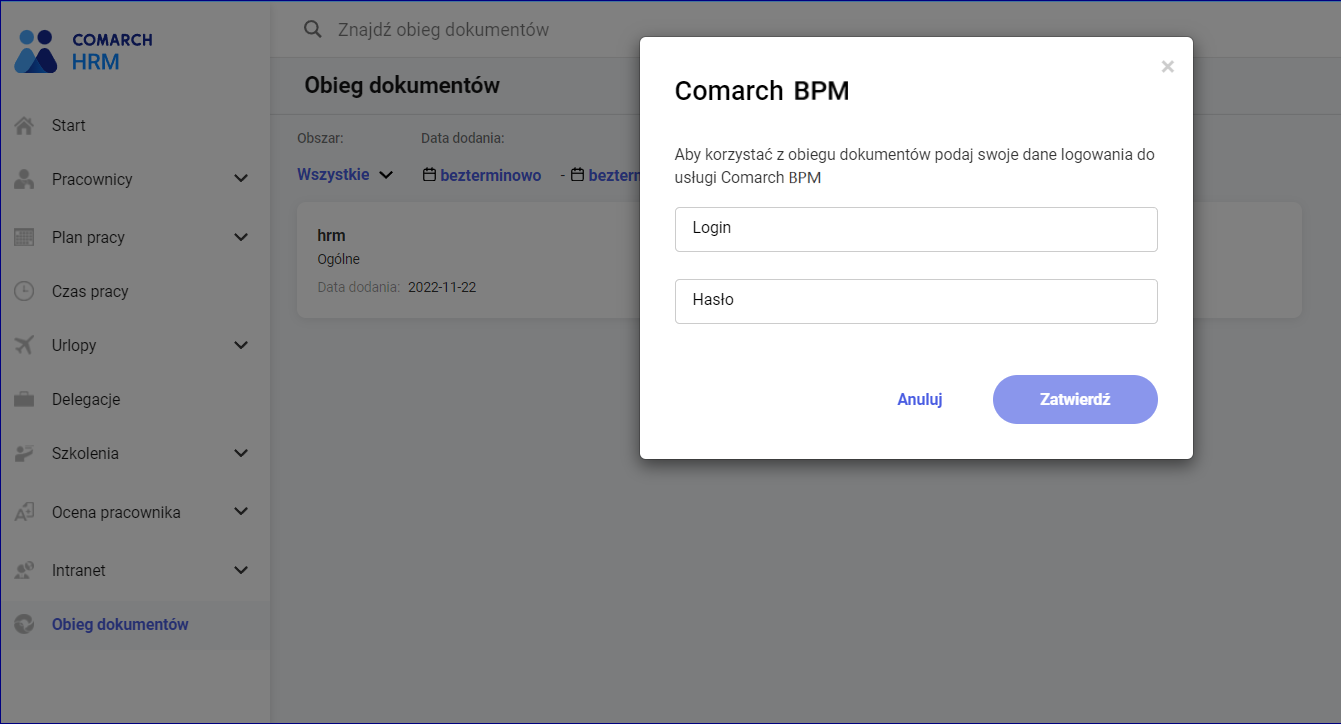 W przypadku zmiany klucza wymiany przez administratora Comarch HRM przy próbie zainicjowania dokumentu lub przejścia do listy dokumentów w Comarch BPM (dawniej DMS) zostanie wyświetlone okno „Comarch BPM”, w którym trzeba wpisac dane logowania do Comarch BPM (dawniej DMS).