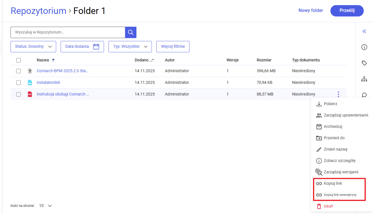 Obydwie opcje kopiowania linków są dostępne dla wszystkich dokumentów (aktywnych, zarchiwizowanych, unieważnionych).