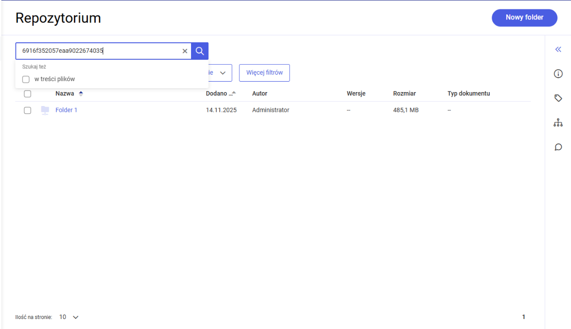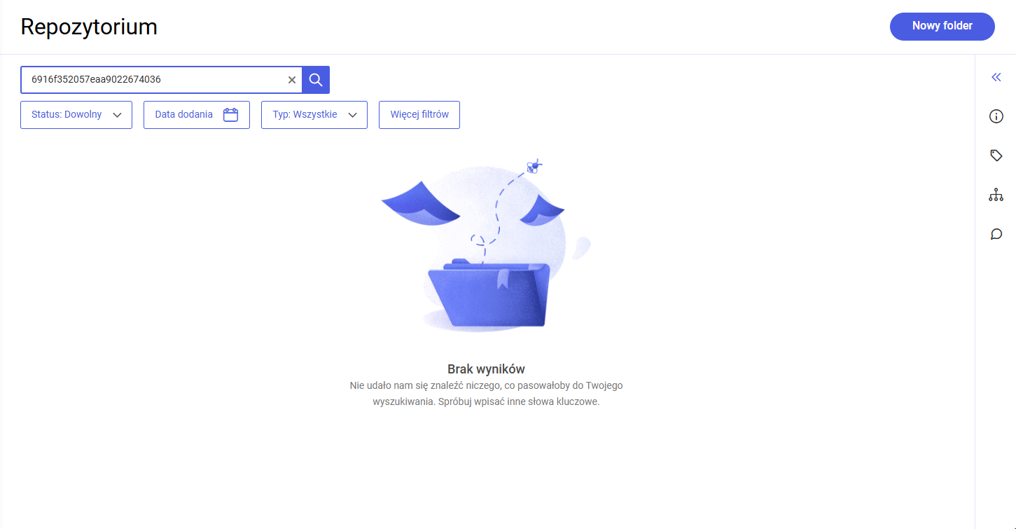 Jeżeli dokument o danym numerze UUID nie zostanie znaleziony, wówczas wyświetli się informacja „Brak wyników“.