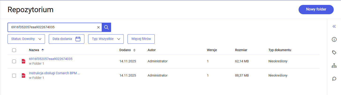 W przypadku, jeśli w module Repozytorium znajduje się dokument, który ma taką samą nazwę, jak inny dokument ma identyfikator (link wewnętrzny), wówczas po wyszukiwaniu danego identyfikatora w Repozytorium na liście wyników zostaną wyświetlone obydwie pozycje.